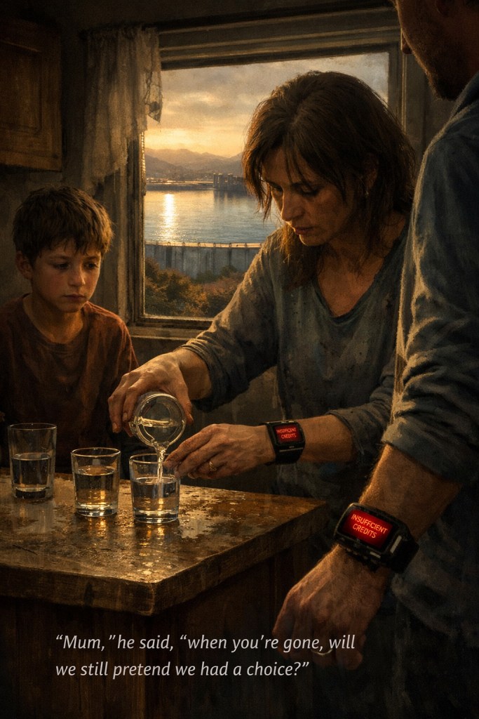 Through the kitchen window, the reservoir gleamed like a promise someone had forgotten to keep. Full, his father said. Overflowing, even. But the meters on their wrists blinked red: INSUFFICIENT CREDITS.