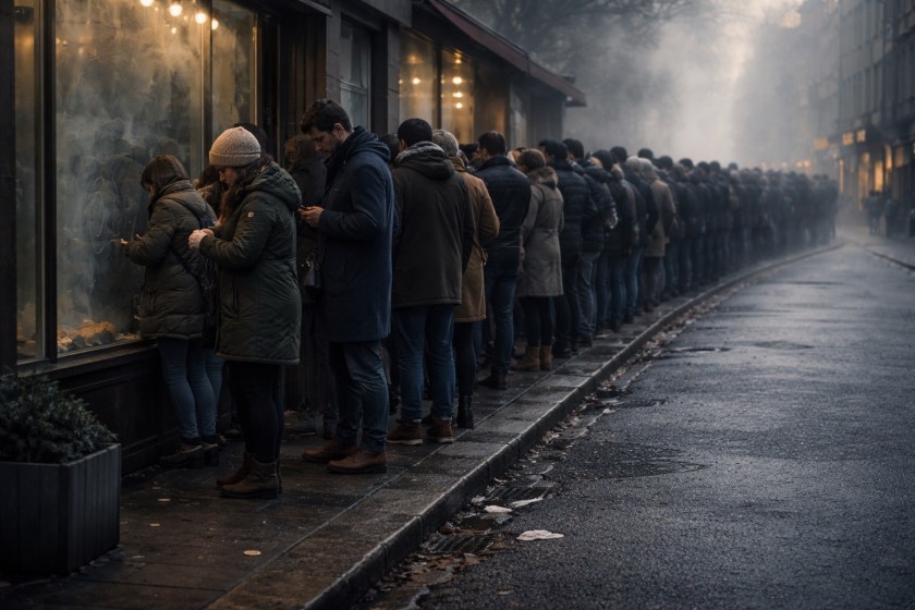 The queue curves along the pavement, shoes scuffed and aligned with the kerb. Someone rocks from heel to toe, then stills. A man lifts his phone, stares at the screen, lowers it again. A woman opens her bag, closes it, opens it once more as if something might have changed inside.