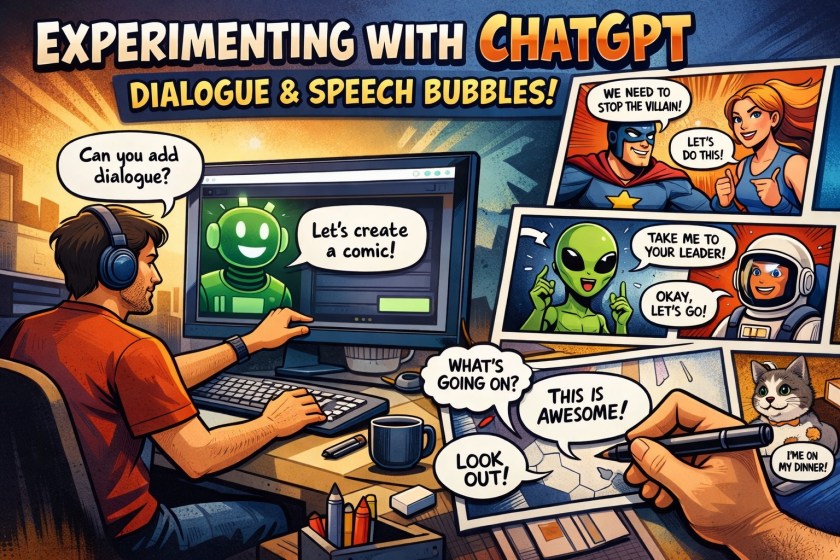 Last week I experimented with ChatGPT’s image creator to create some 6 panel graphic comics. Today I am seeing how well it can cope with dialogue and speech bubbles.