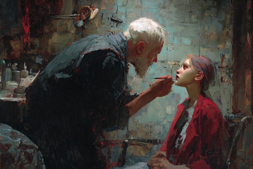 The image itself gave me an immediate fairy tale unease. The power dynamic between the elderly figure and the young girl, the intimacy of the gesture, the paintbrush touching her lips, the muted palette with those sharp reds, it all felt like a scene caught halfway between tenderness and predation. I wanted the story to live in that ambiguity.