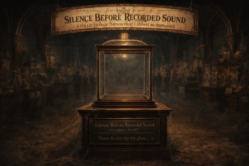 This exhibit cannot be displayed. What you are experiencing now is not silence, it contains the distant compression of traffic, the hum of the building’s ventilation, the sound your own blood makes when everything else stops. True silence, the kind that existed before Edison pressed a needle into tin foil and pulled sound back out of it, has not been available since. We have included an empty case as a placeholder. Please do not tap the glass.